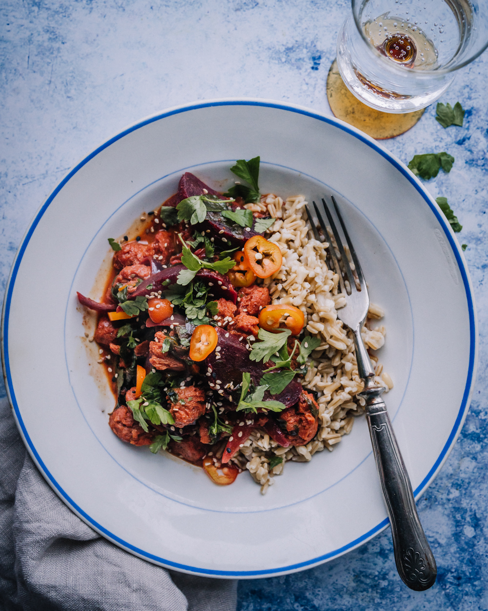 - Lisää punajuuret ja kookosmaito, kuumenna kiehuvaksi. Sekoita joukkoon pakastepinaatti, anna sulaa. Mausta curry limen mehulla ja soijakastikkeella. Viimeistele chilillä ja korianterilla. Tarjoile lisukkeena esimerkiksi keitettyä kauraa.
