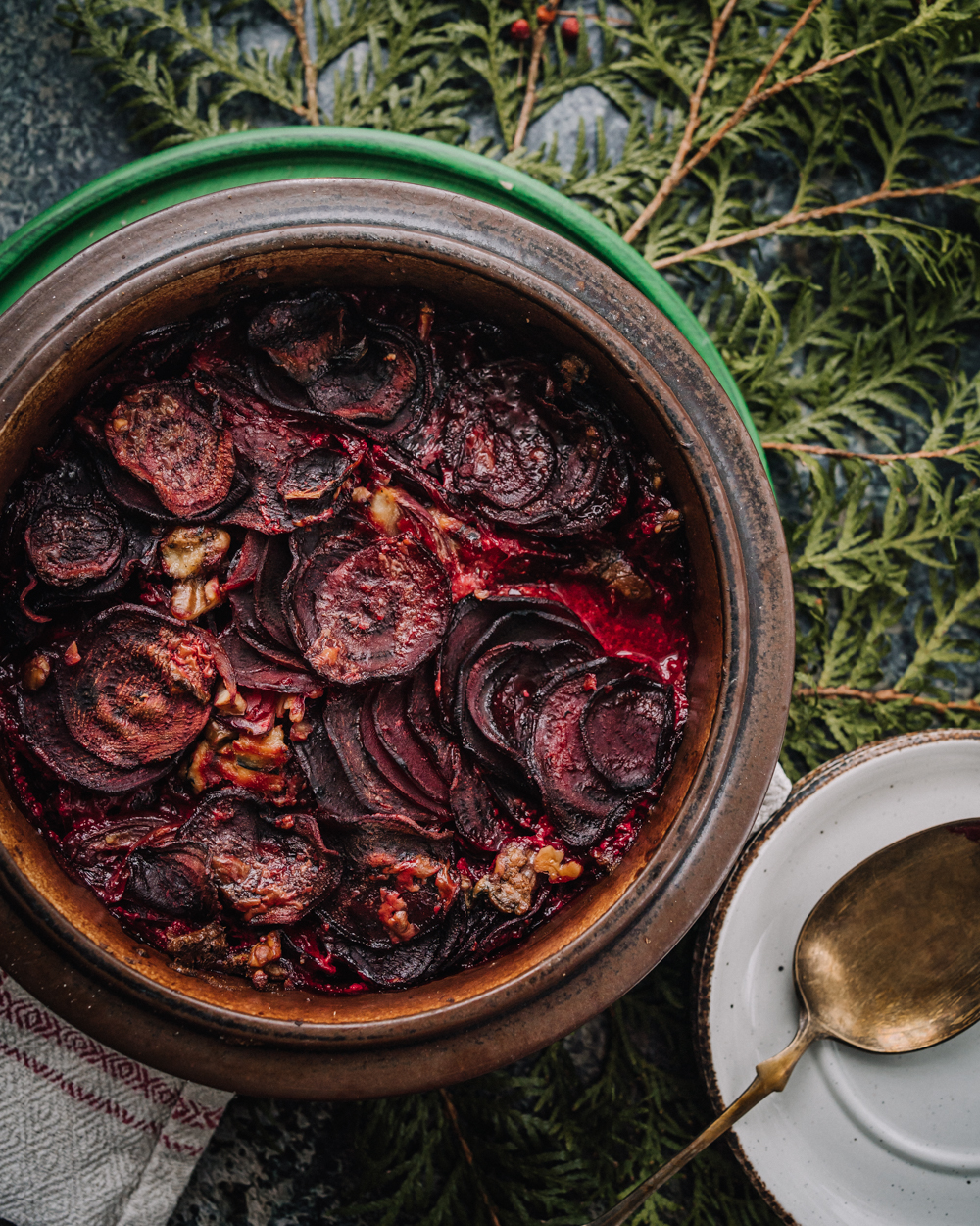 Punajuurivuoka on joulupöydän väripilkku! Herkullisessa vuuassa maistuvat pekaanipähkinät ja vegaaninen sinihomejuusto. Santsaustakuu!