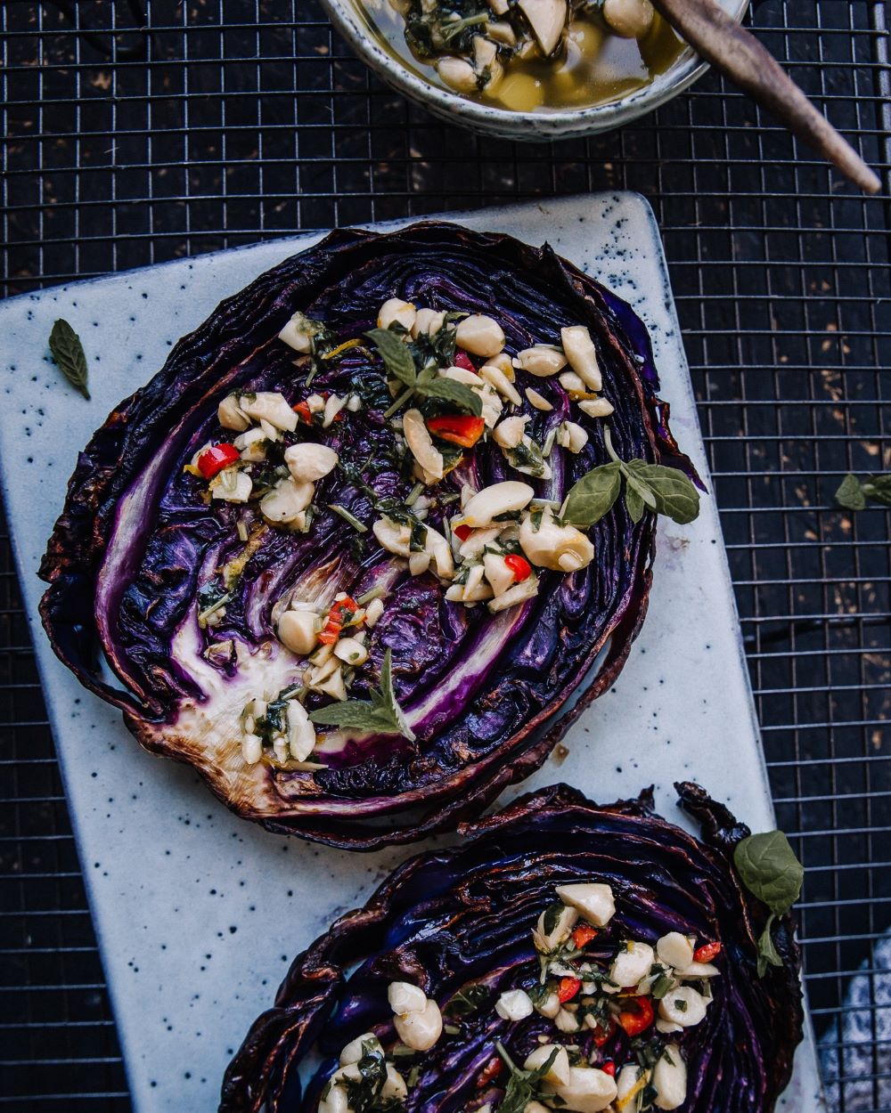 Punakaalipihvit saavat yllensä aromaattisen mantelikastikkeen, jossa maistuu myös minttu, chili ja appelsiinin kuori. Voit tehdä kastikkeesta halutessasi juoksevamman lisäämällä öljyn määrää tai vastaavasti vähentää sitä, jos haluat rouheamman lopputuloksen.