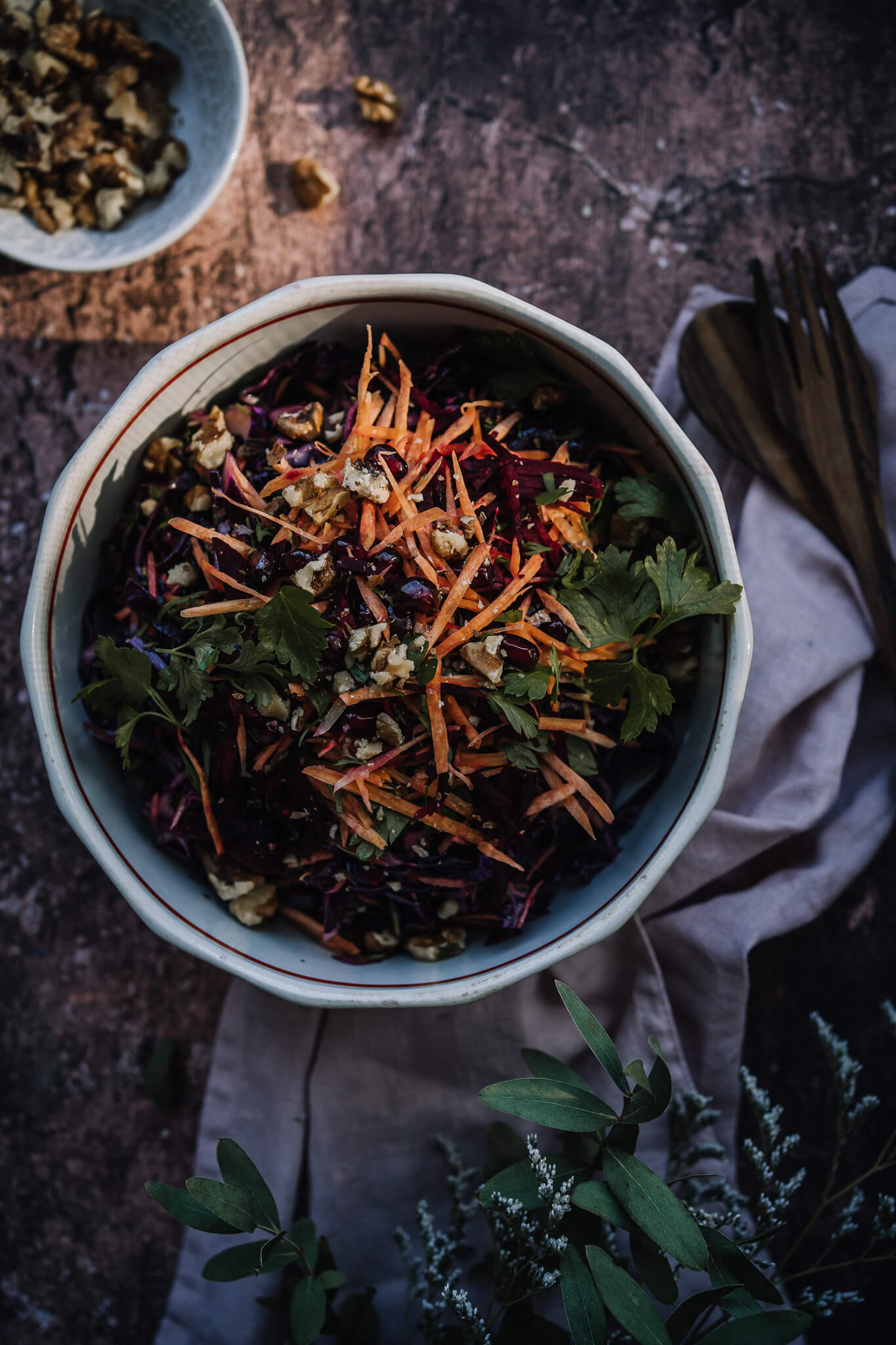 Veikeän punakaalislawn makumaailman viimeistelevät sitruunan kuori, erilaiset yrtit, paahdetut saksanpähkinät sekä granaattiomenan siemenet. Lisäksi joukkoon voi höylätä mandoliinilla punajuurta ja porkkanaa, mutta ne eivät ole pakollisia. Ruokavirasto ei suosittele punajuuren syömistä raakana, joten voit hyvin käyttää myös kypsää punajuurta niin halutessasi. Saksanpähkinät voi korvata muilla pähkinöillä tai siemenillä. Yrtteinä voit käyttää omia suosikkejasi.