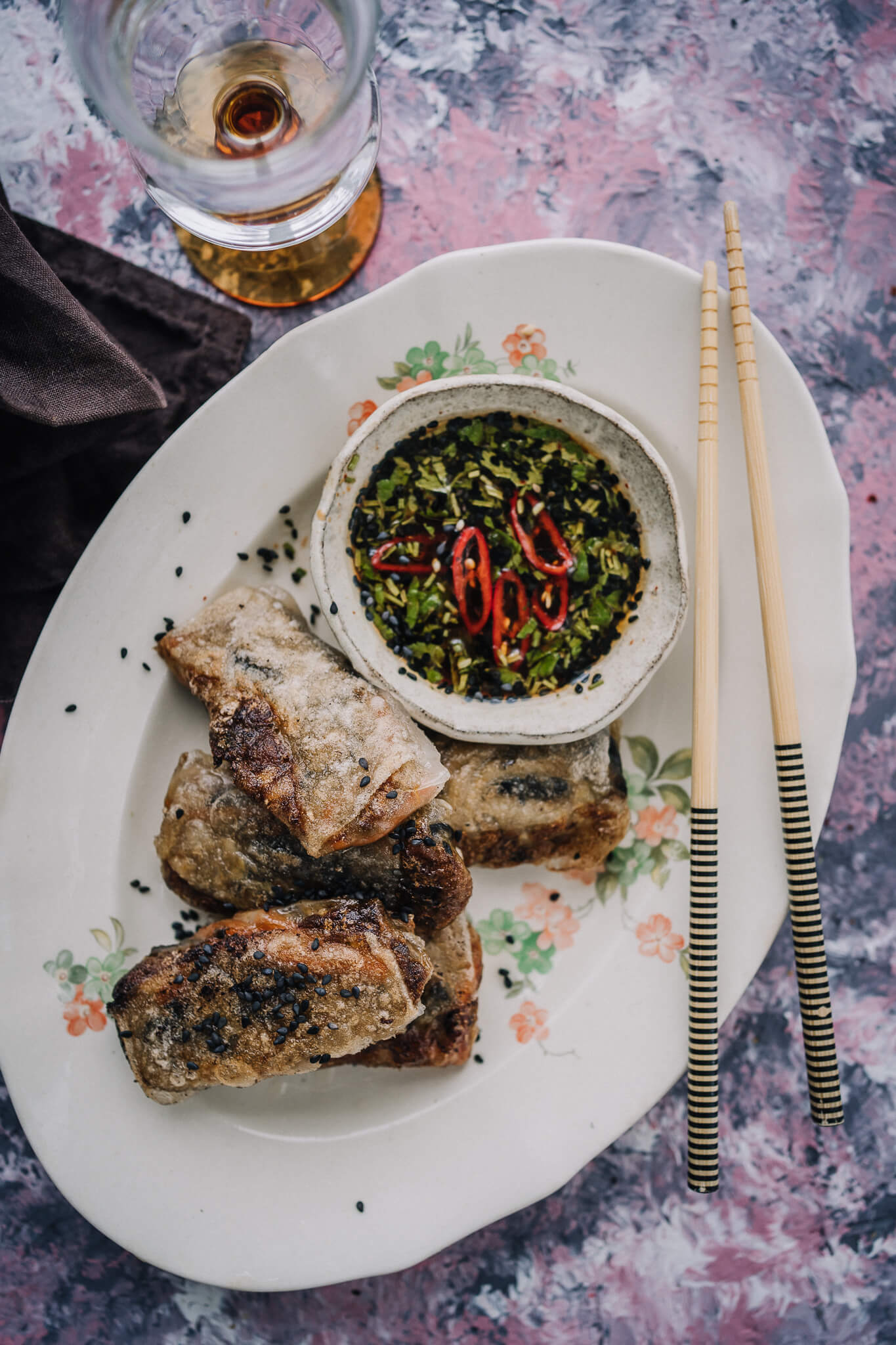 Riisipaperidumplingsit sienillä, tempellä tai tofulla ja kasviksilla täytettynä. Nämä rapeaksi paistetut vegaaniset dumplingsit ovat hauskaa ja herkullista syötävää.