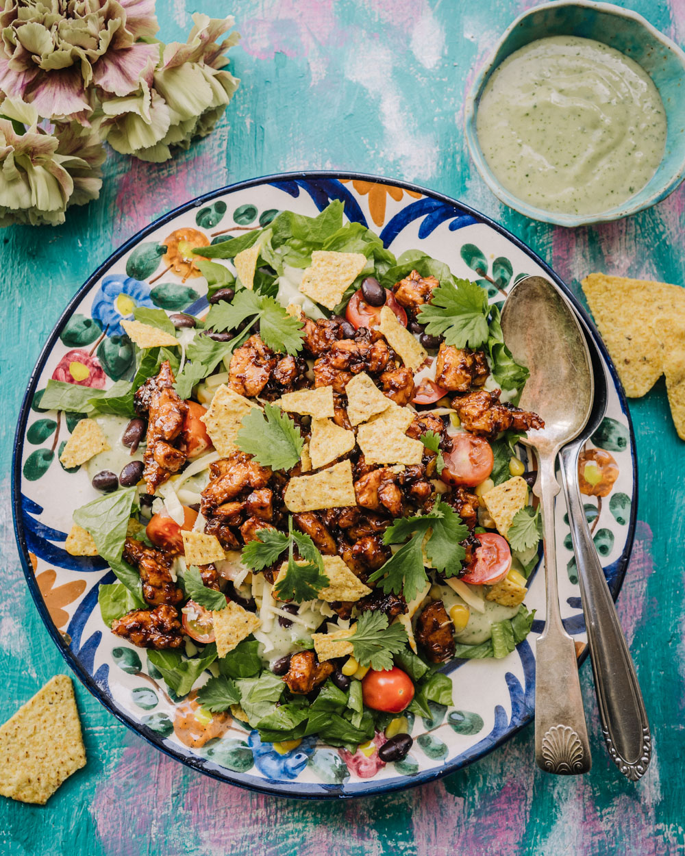 - Kasaa salaatti tarjoiluvadille. Sekoita osa kastikkeesta suikaloidun salaatin sekaan ja levitä salaatti vadin pohjalle. Kasaa sen päälle maissit, pavut ja kirsikkatomaatit. Lisää vielä juustoraaste ja vegekana. Viimeistele nachoilla ja koristele korianterin lehdillä, jos säästit niitä. Tarjoile salaatti lopun kastikkeen kanssa.