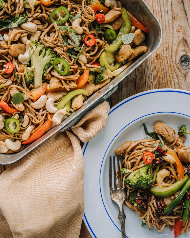 - Sekoita nuudelit, chow mein -kastike ja cashew-pähkinät pellille kasvisten joukkoon. Paista vielä 5 minuuttia.
