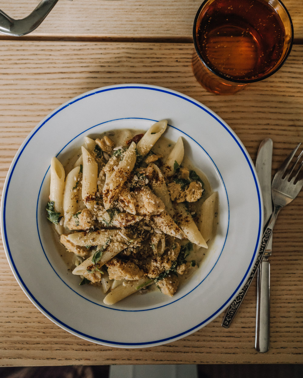 - Lisää soijasuikaleet, vuohenputket (kokonaisina lehtinä tai hienonnettuna, oman maun mukaan – mutta vinkkinä, että lapsille maistuu yleensä paremmin hienonnetut vihreät kasvikset) ja kaurakerma. Keitä hetki ja lisää sitten pasta. Anna kuumentua.