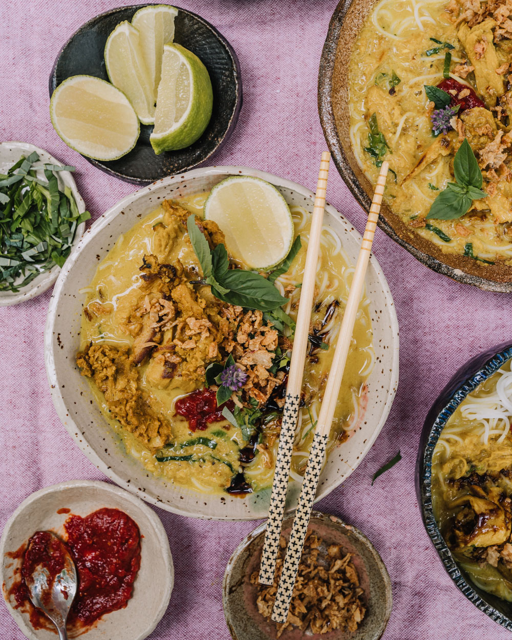 - Jaa nuudelit ja vegekanat neljään kulhoon. Jos nuudelit ovat ehtineet liimaantua yhteen, nopea huuhtelu kylmällä vedellä auttaa asiaan. Kauho liemi päälle ja viimeistele annokset tuoreilla yrteillä ja lehtisellerin lehdillä. Tarjoile lisäksi kecap manisia, sambal oelekia, rapeaa sipulia ja limelohkoja.