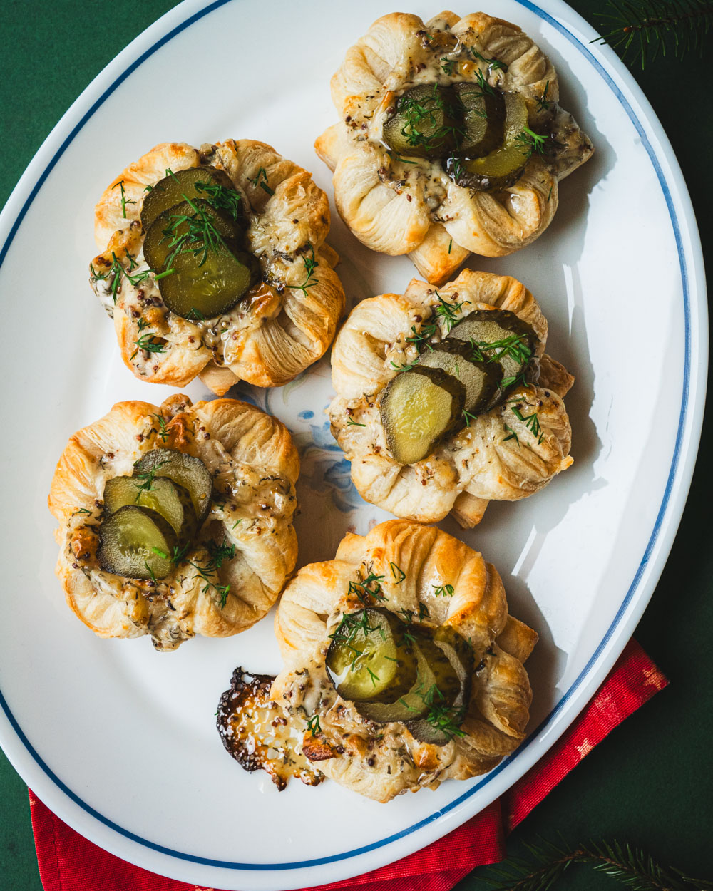 Suloiset suolakurkkutortut ovat mukava suolainen vastapari joulun makeammille leivonnaisille. Rapean torttutaikinan sisällä on täyteläinen tillillä ja sinapilla maustettu täyte, ja päälle kootaan suolakurkkusiivut ja loraus agavesiirappia. Helppo ja nopea suolainen tarjottava pikkujouluihin, glögikutsuille tai alkupalapöytään.