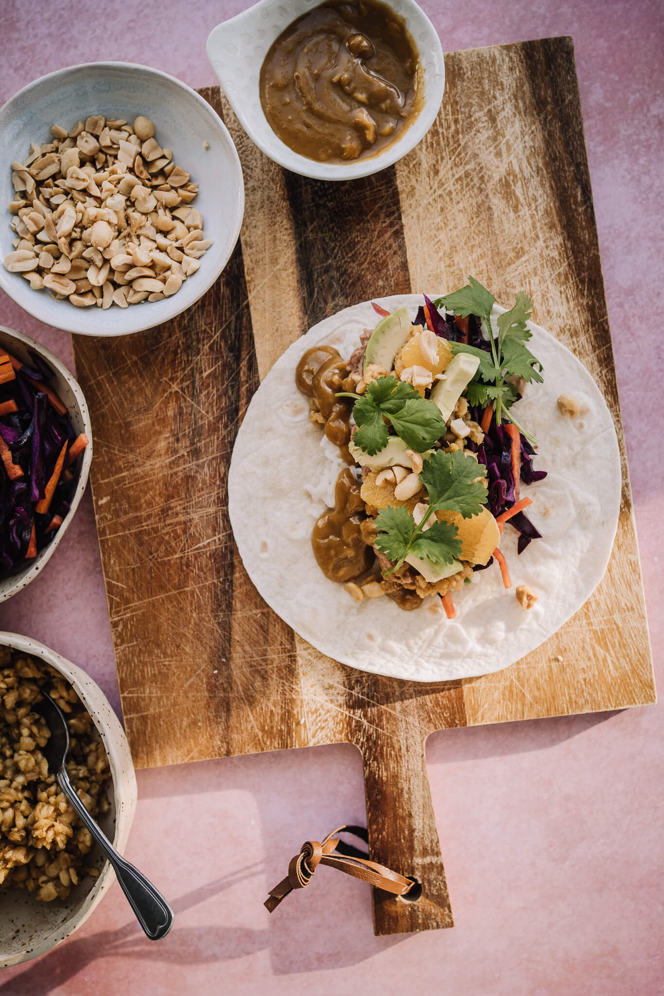 Tempehtortillat aasiatwistillä! Näissä tortilloissa on runsaasti kasviksia ja ihanaa appelsiinilla maustettua maapähkinävoikastiketta.