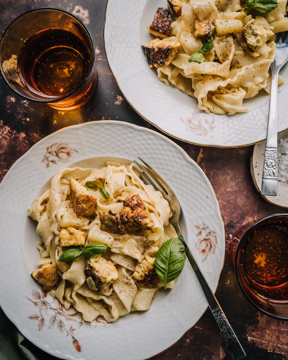 - Pastan kiehuessa ota tofu pois pakkauksesta ja painele kuivaksi puhtaalla keittiöpyyhkeellä. Murustele tofu käsin paistinpannulle ja paista pari minuuttia kuivalla pannulla. Lisää 2 rkl öljyä ja ruskista. Mausta broilerimausteella. Siirrä sivuun odottamaan.