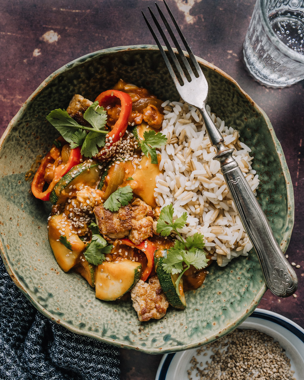 - Viimeistele tuoreella hienonnetulla korianterilla ja seesaminsiemenillä. Tarjoile esimerkiksi keitetyn kauran ja/tai riisin kanssa.