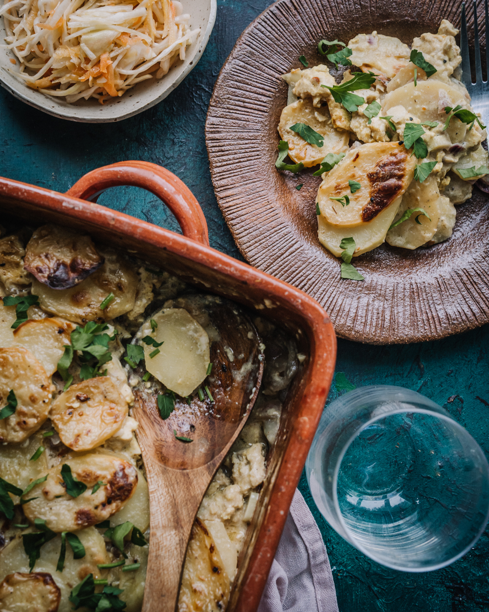 - Paista tofu-perunalaatikkoa noin tunnin ajan tai kunnes perunat ovat kypsiä. Anna vetäytyä 15 minuuttia ennen tarjoilua.
