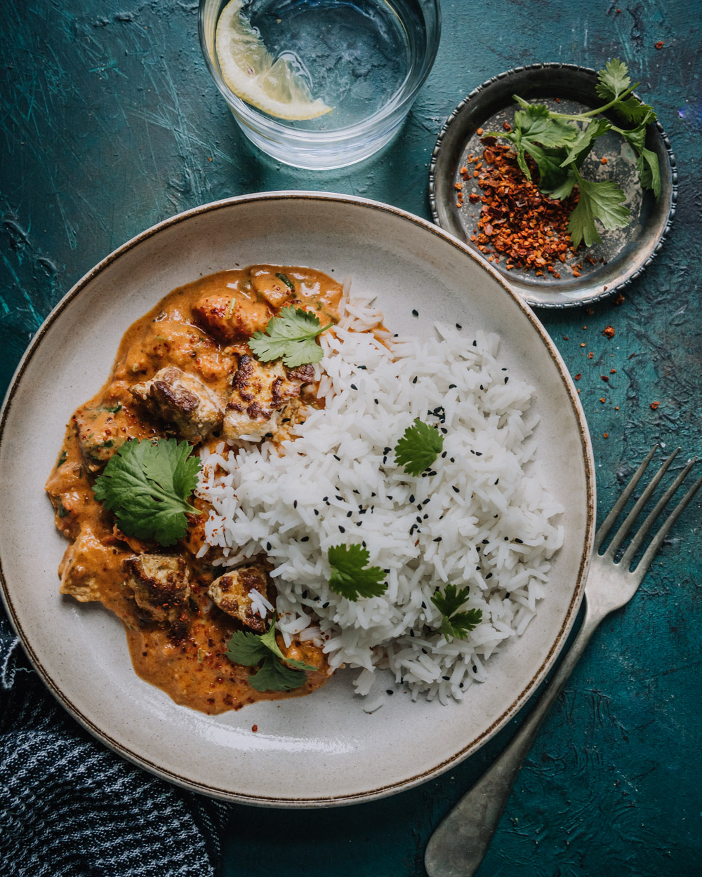 - Lisää tofut ja kookosmaito. Anna kuumentua. Mausta suolalla, mustapippurilla ja limen mehulla. Viimeistele tuoreella korianterilla ja chilillä (voit myös tarjoilla chilin erikseen pöytämausteena).