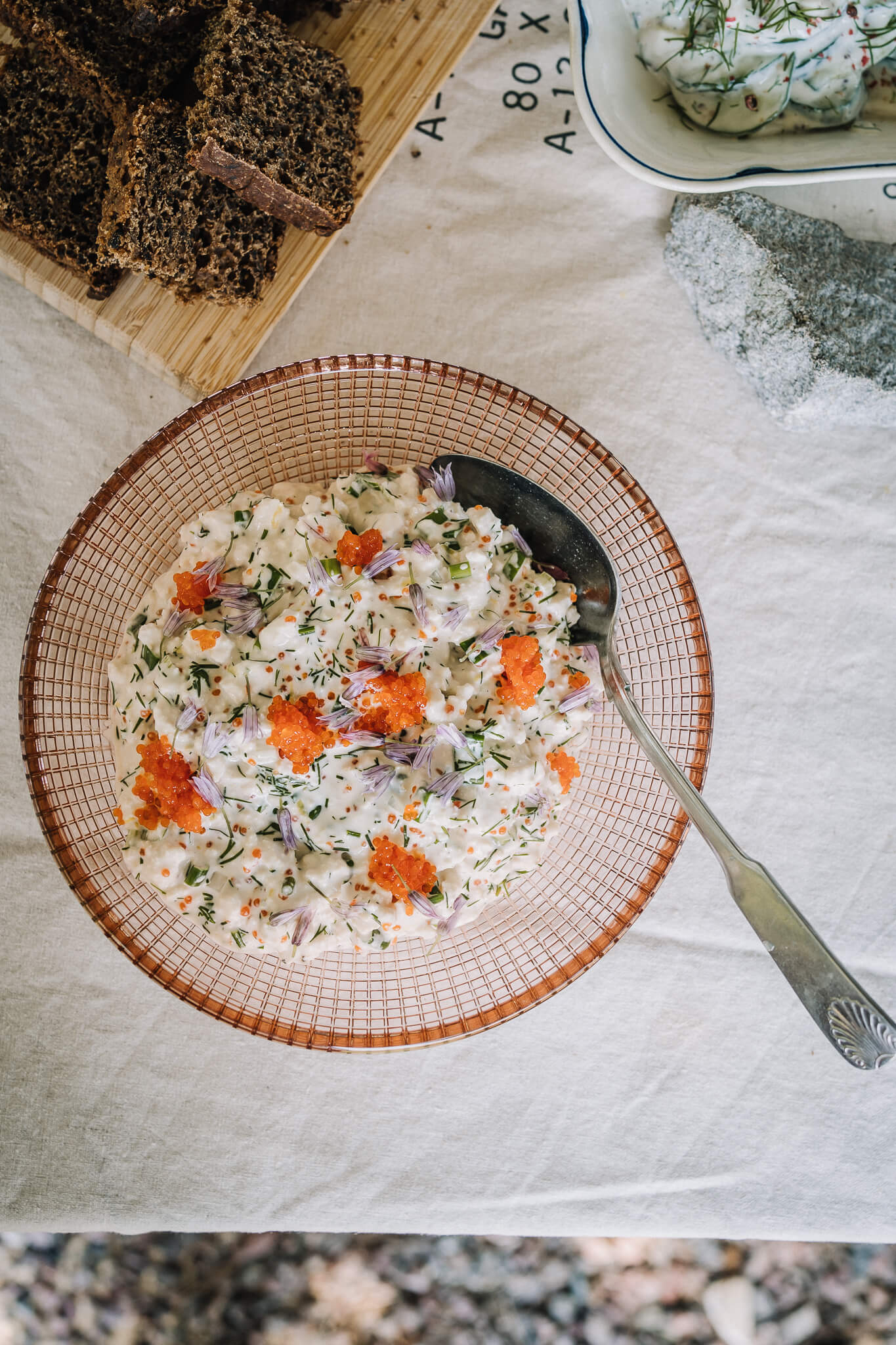 Tähän jää koukkuun. Tofusta ja merilevämädistä valmistettava skagen maistuu niin varhaisperunoiden kuin leivänkin kanssa. Sen tekeminen on helppoa ja ainoa hieman aikaa vievä osuus on tofun prässääminen kuivaksi. Se kannattaa kuitenkin tehdä, jotta lopputulos olisi paras mahdollinen. Lisäksi skageniin tulee kaurafraichea ja majoneesia sekä sitruunaa, nippusipulia varsineen ja tilliä. Mausteeksi riittää ripaukset suolaa ja valko- tai mustapippuria.