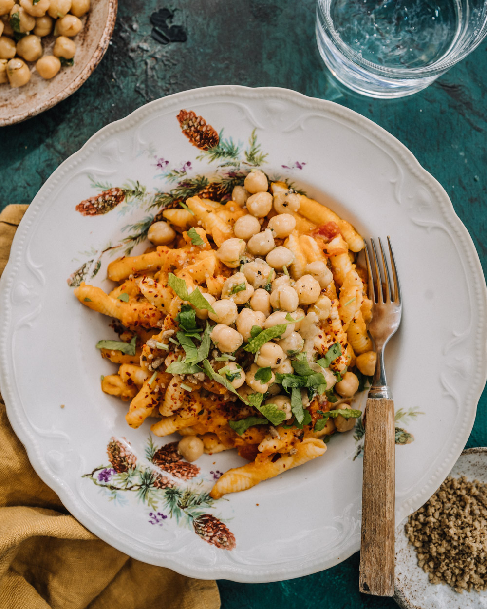 Tomaatti-bataattipasta on paitsi herkullista ruokaa, myös ovela tapa ujuttaa kasviksia ruokavalioon. Bataatti antaa pastakastikkeelle kermaisen rakenteen ja aromaattisen maun. Marinoidut kikherneet sopivat ihanasti pastan kanssa tarjottavaksi.