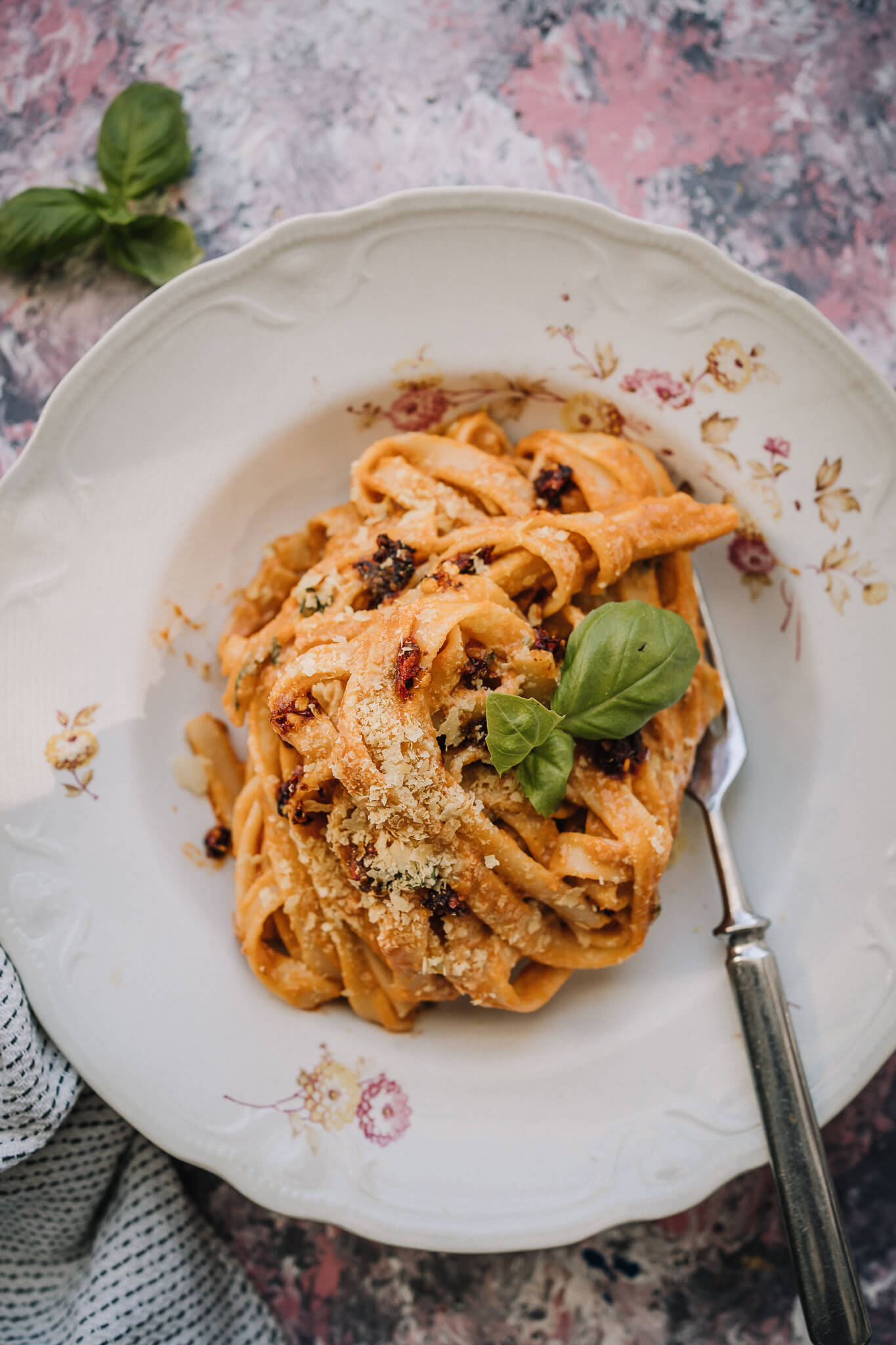 Tarjoile tomaattisen tofupastan kanssa mieluista vegeparmesaania tai ripottele pinnalle juustoisen makuisia ravintohiivahiutaleita. Tämän pastan kanssa ei ketsuppia tarvita, mutta somessa vahvasti trendaava crispy chilli in oil sopii joukkoon sekoitettavaksi täydellisesti.