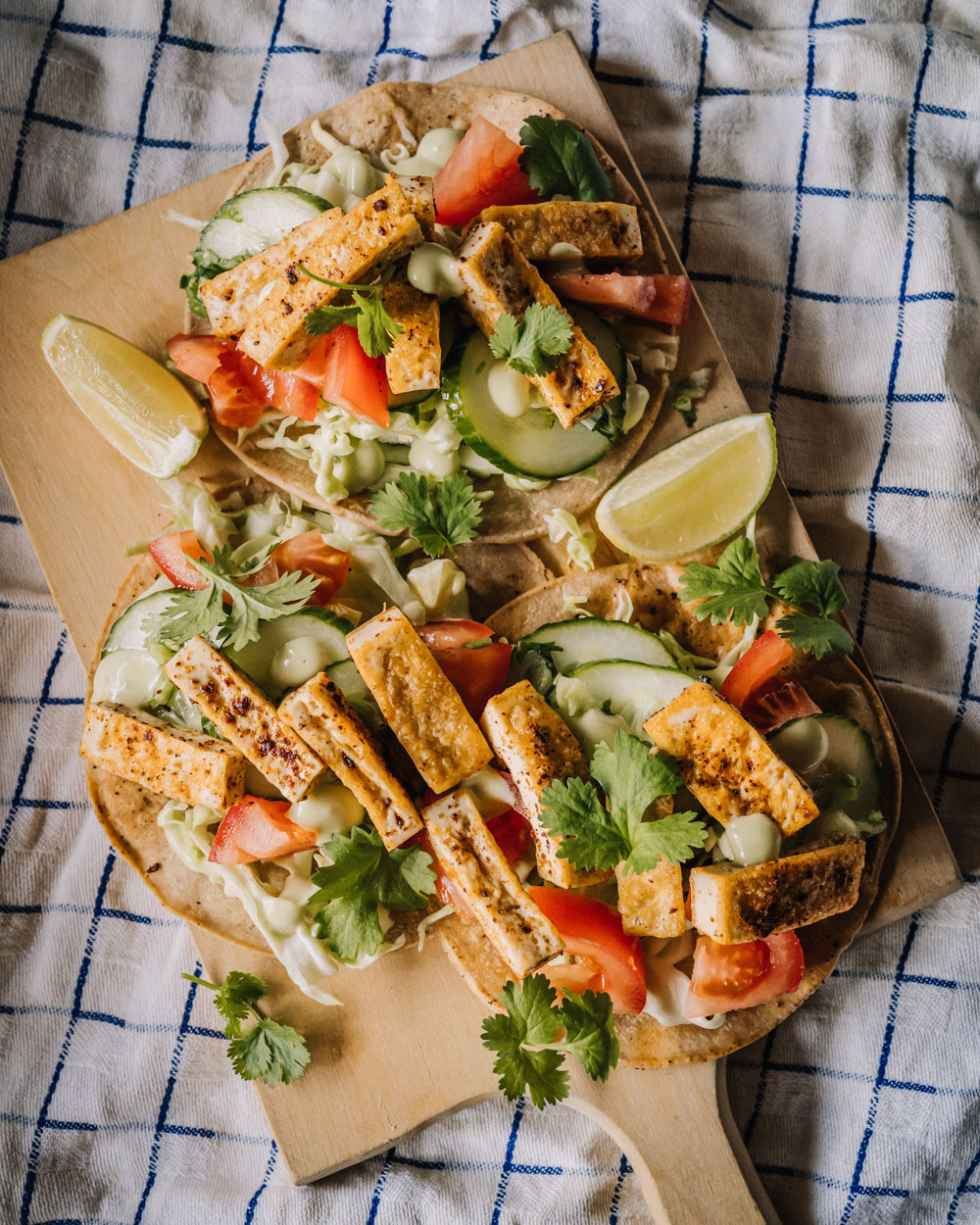 Halloumitacot, but make it vegan! Onnistuu! Näissä ihanissa tacoissa vegehalloumi maustetaan harissalla ja kaverikseen se saa raikkaita limekurkkuja, varhaiskaalia ja tomaattia.