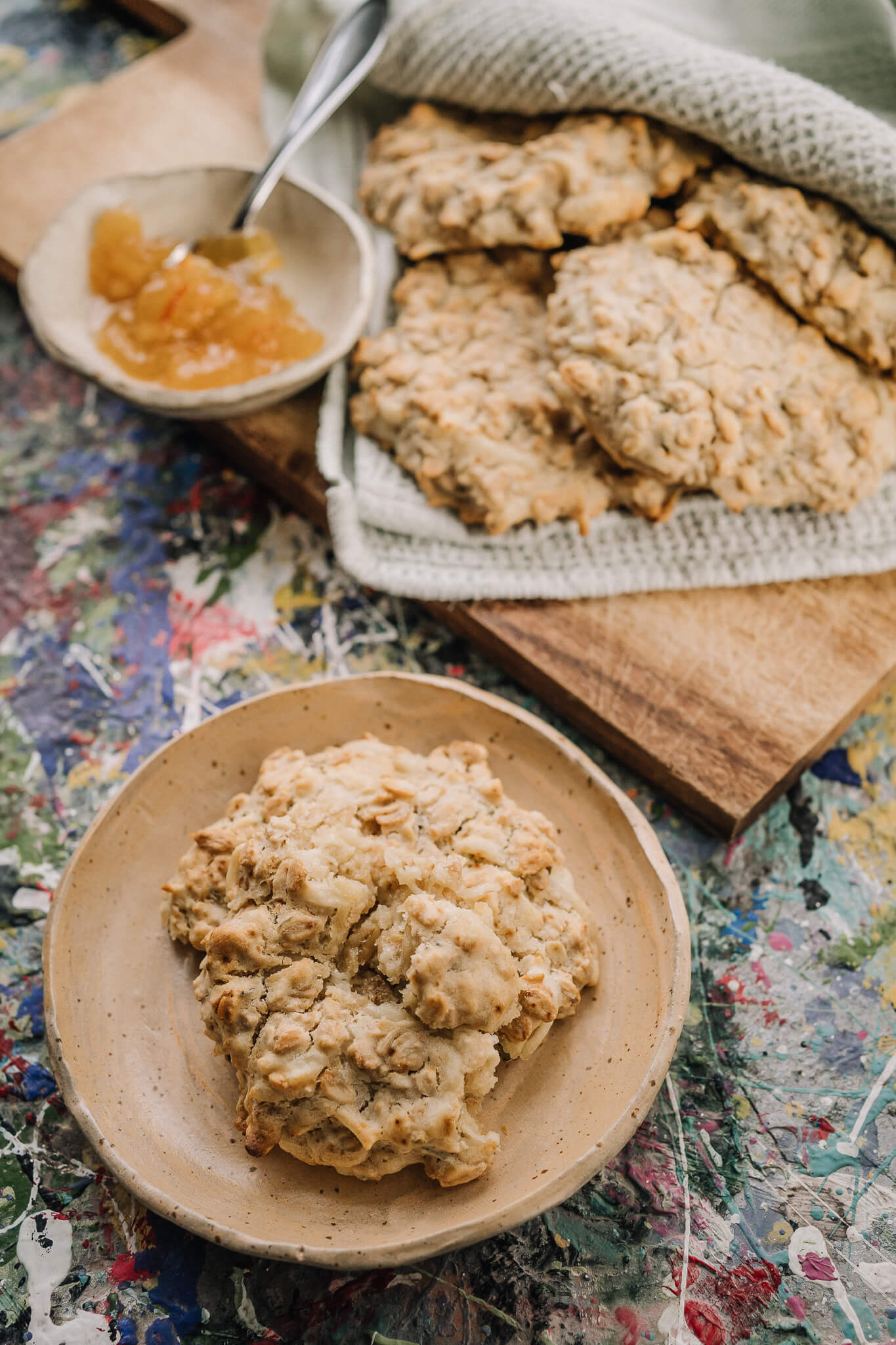 Näissä teeleivissä on runsaasti kaurahiutaleita ja vegaanista juustoraastetta eli vuustoraastetta. Mausteeksi sopii hyvin tuore rosmariini, mutta sen voi jättää poiskin.