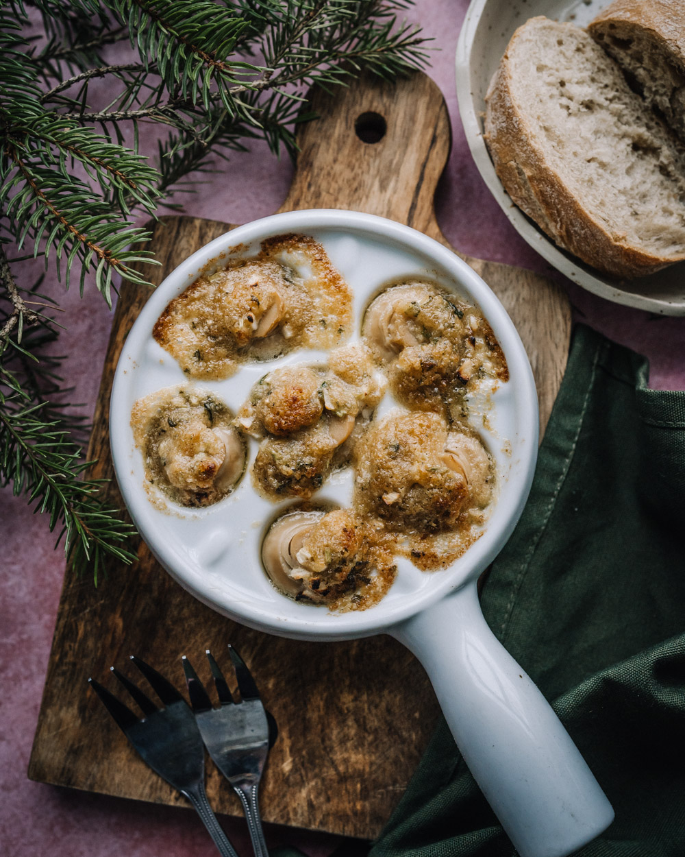 Vetanat eli vegaaniset etanat valmistuvat säilykeherkkusienistä ja muistuttavat esikuvaansa niin rakenteen kuin maunkin puolesta. Upean aromaattinen valkosipuli-yrttivoi viimeistellään ravintohiivahiutaleilla ja korppujauhoilla.