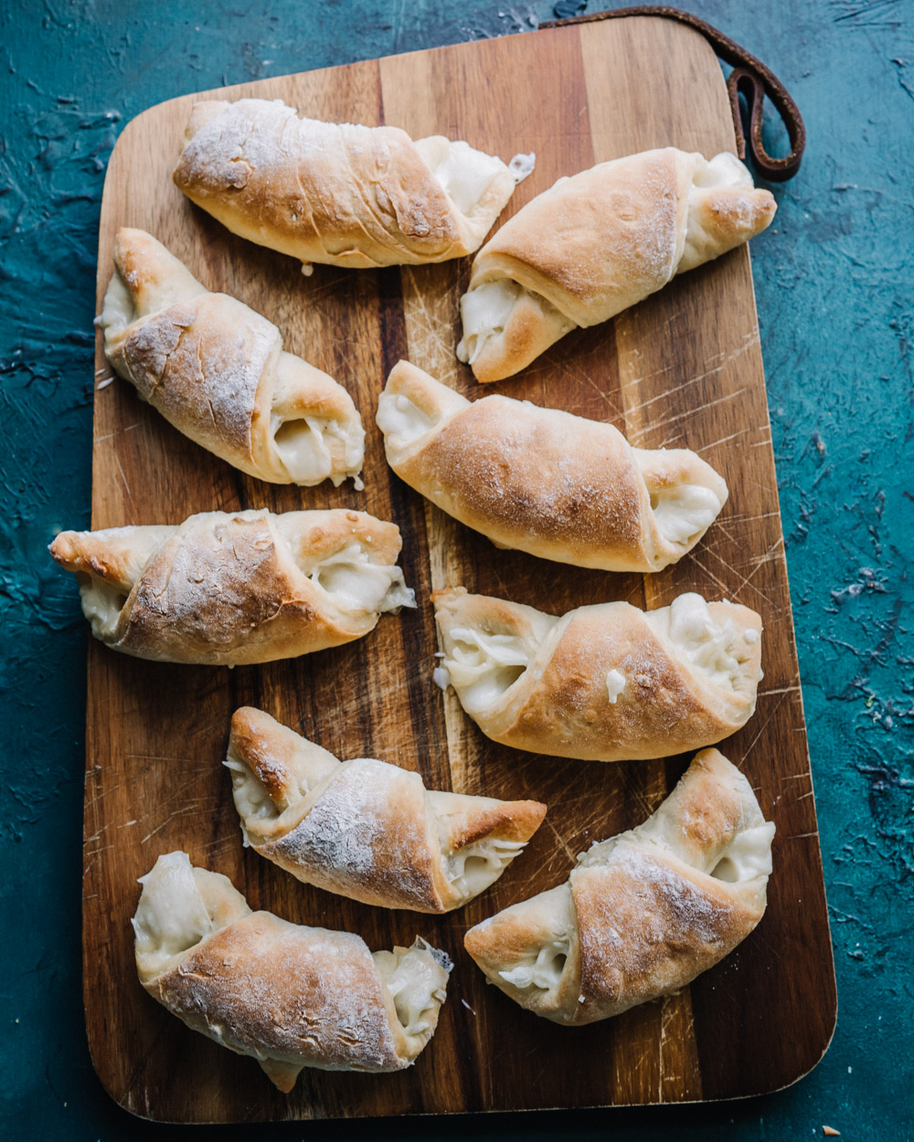- Jaa 1 ½ dl juustoraastetta kolmioiden leveisiin päätyihin ja rullaa taikinat sarviksi. Siirrä leivinpaperille uunipellille.